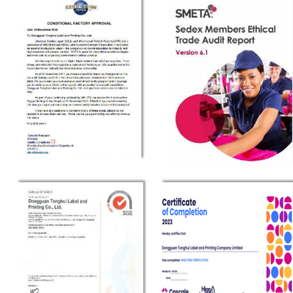 主營生產和銷售:各類織嘜商標,織章,印刷商標,印嘜,標簽印刷,不干膠商標,絲印商標,熱轉印標,無感商標,燙嘜,皮牌商標,電壓商標、商標帶、繡花標,布貼標、皮貼標、商標吊牌,彩卡,折盒等廣泛用于各行各業。工廠經過多年的發展與開拓,規模日益發展壯大。從設計制作、工程研發、生產制造、產后加工、品檢、物流配送、售后服務等一套完整的優質服務體系,及優秀的經營管理團隊。已通過SGS ISO9001:2008(新版是2015版)國際質量體系認證,產品質量符合各國安全出口環保標準。承蒙國內外客戶的大力支持,目前已有許多國際著名品牌定點授權我公司生產,并是通過全球迪士尼FAMA認證驗廠,麥當勞驗廠,環球影視驗廠的供應商,是各行業值得信賴并具有實力的合作伙伴。